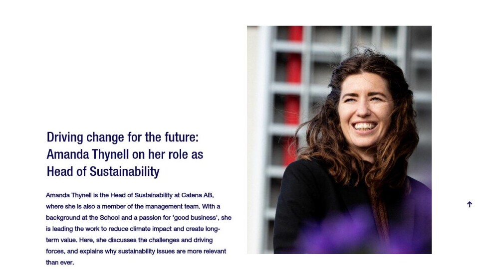 Amanda Thynell is the Head of Sustainability at Catena AB, where she is also a member of the management team. With a background at the School and a passion for 'good business', she is leading the work to reduce climate impact and create long-term value. Here, she discusses the challenges and driving forces, and explains why sustainability issues are more relevant than ever.