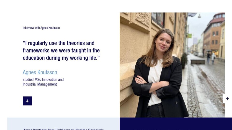 Agnes Knutsson from Linköping studied the Bachelor's Programme in Business and Economics and has a Bachelor's degree in Financial Economics. She wanted to add a focus on practical business problems and working with cases and chose to continue her studies on the Master's programme Innovation and Industrial Management.