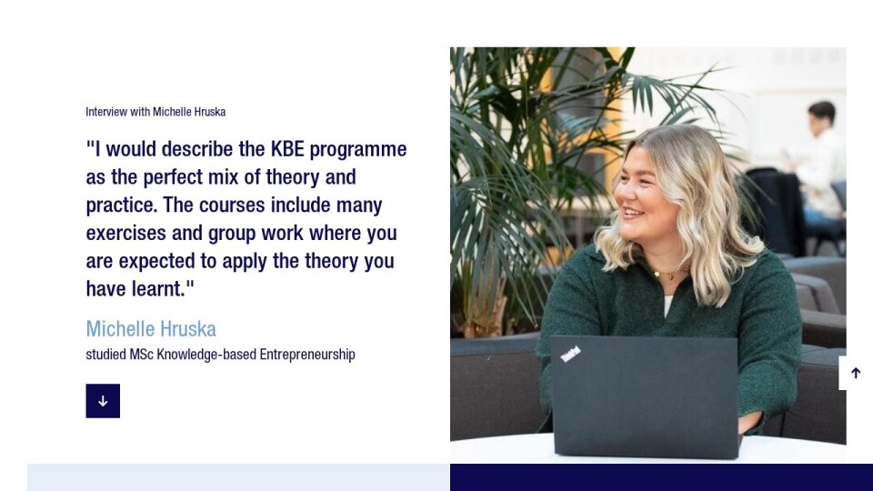 "When I encountered this Master's programme, it felt like a calling," says Michelle Hruska from Stockholm. She shares her experience in the MSc Knowledge-based Entrepreneurship (KBE) programme. Michelle reflects on her intentional choice, the courses that sparked her curiosity, the perfect mix of theory and practice, and the School's connections with the business community.